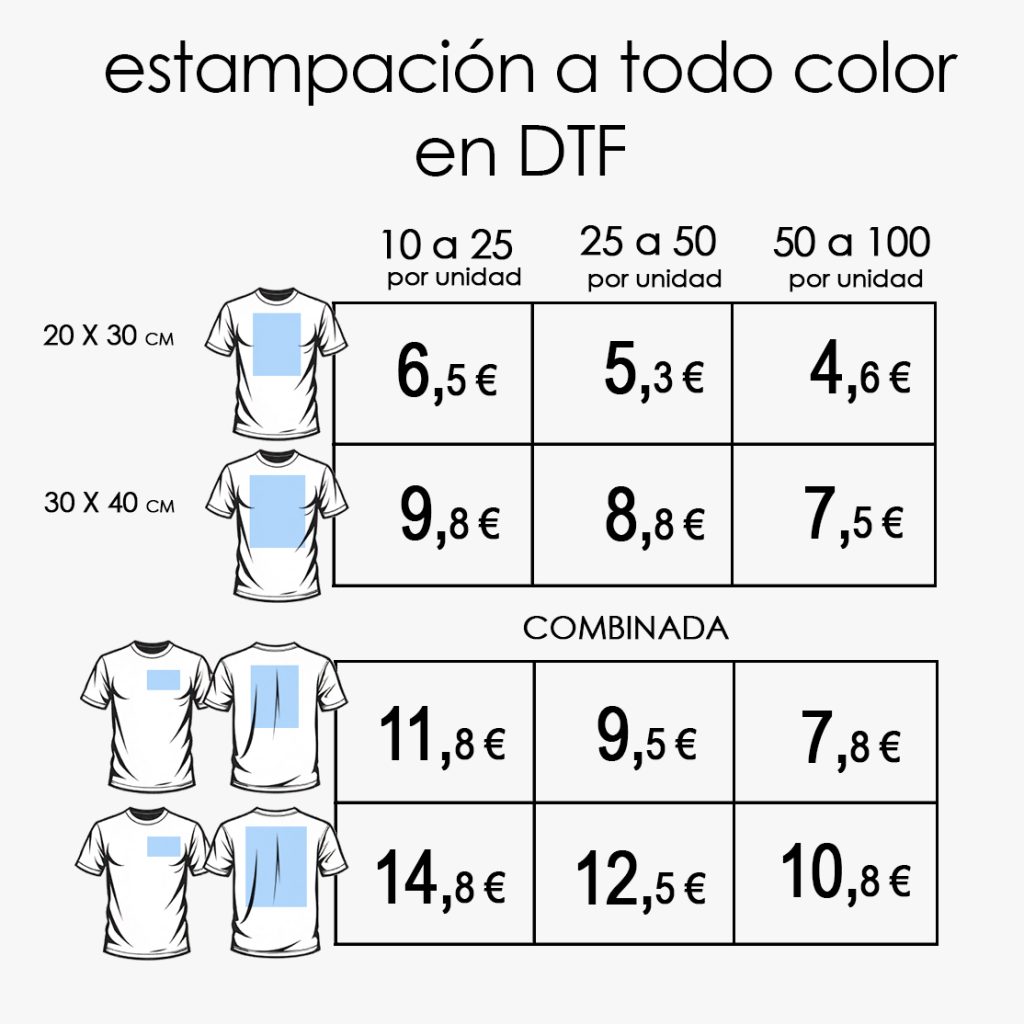 Utilizamos diversos métodos de estampación, siendo el principal el DTF. Esta técnica nos brinda la ventaja de eludir los costos asociados a los fotolitos y los gastos adicionales por color presentes en la serigrafía. Gracias a ello, tenemos la capacidad de producir camisetas a todo color a precios competitivos, sin la obligación de realizar pedidos voluminosos.
